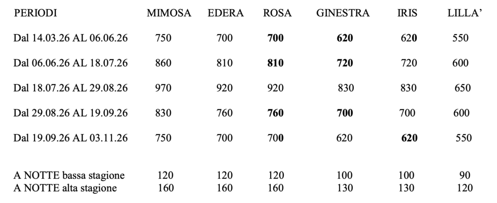I prezzi indicati si riferiscono all’appartamento per una settimana, da sabato a sabato. Per soggiorni più brevi vi preghiamo di contattarci.